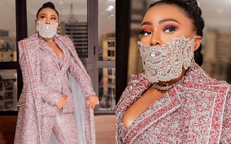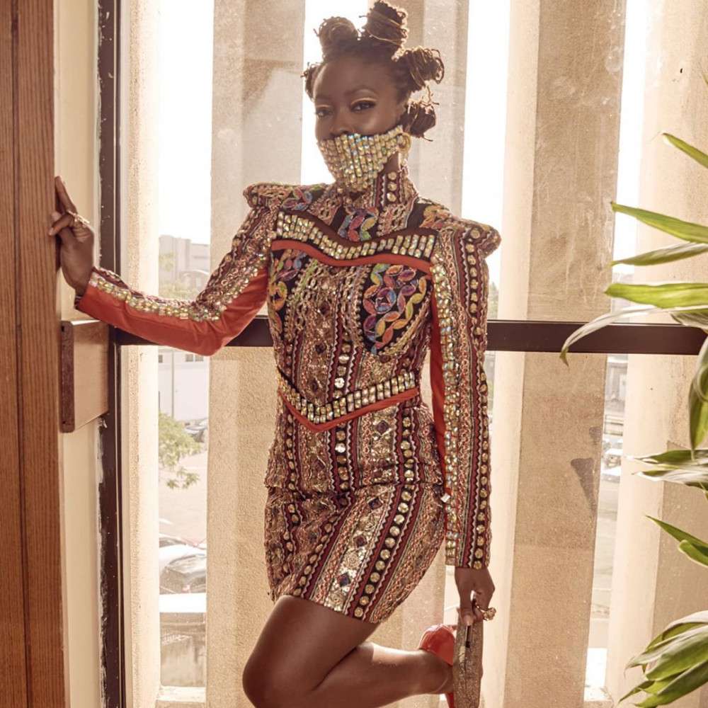 Nhà thiết kế Ifu Ennada gây chú ý tại Africa Magic Viewers’ Choice Awards với bộ đồ sequin lấp lánh và chiếc khẩu trang lạ mắt.