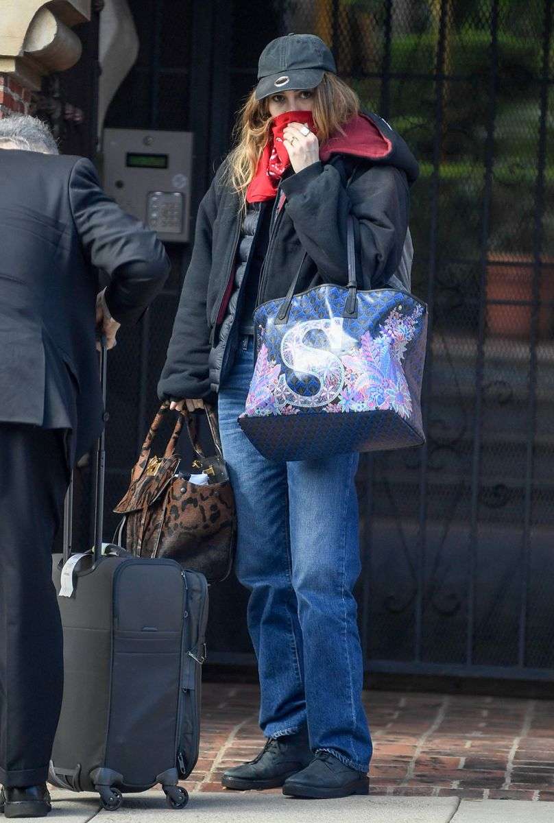 Nữ diễn viên Suki Waterhouse quấn khăn quàng cổ cao đến mũi để hạn chế phơi nhiễm virus corona khi tiếp xúc với nhiều người.