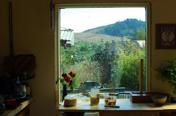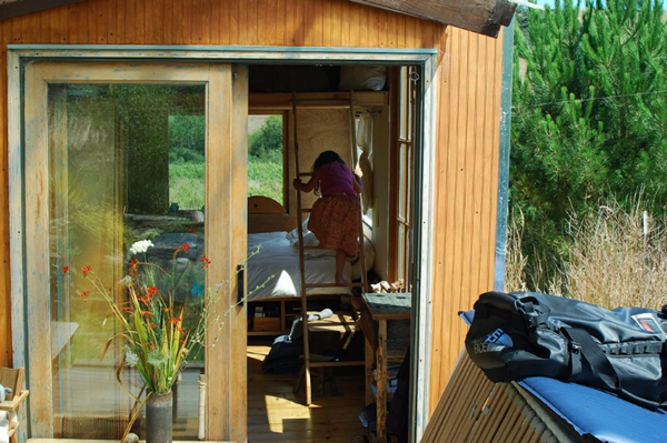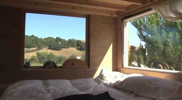 Phòng ngủ nhìn ra phía trước là ngọn đồi với cây cối xanh tươi, sáng sớm nắng có thể hắt vô khung cửa.