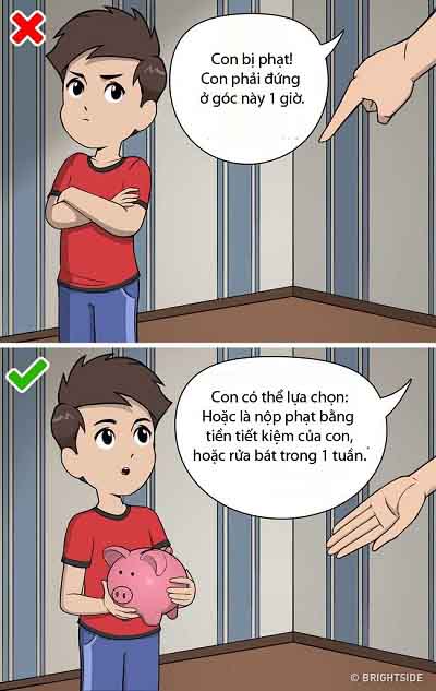Hãy nói chuyện với con như những người lớn, giải thích về hành động của chúng và lý do tại sao chúng bị phạt. Để con tự lựa chọn và học cách chịu trách nhiệm cho lựa chọn của mình. Phụ huynh cần nhớ rằng bạo hành cảm xúc không bao giờ là một cách tốt. Bởi vậy thay vì bắt con đứng ở góc nhà trong một thời gian dài để suy nghĩ về hành động của mình, hãy cố gắng nói chuyện và cùng nhau tìm cách sửa sai.