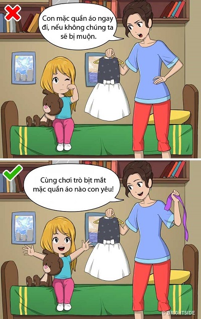 Khi bị áp đặt, trẻ thường tỏ ra khó chịu, không hợp tác. Thế nên lúc này, bạn có thể đưa trẻ vào một trò chơi chọn quần áo nhanh gọn. Trẻ con thích các trò chơi nên sẽ dễ dàng hợp tác với bạn.