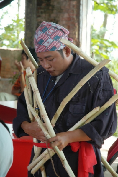 Không biết giận dỗi ai mà danh hài Tấn Beo lại trang bị các loại vũ khí hạng “nặng” là những cây… mía lau như thế này. Hỏi ra mới biết, anh đang chuẩn bị chiến đấu “một mất một còn” cùng anh Bo Đan Trường trong bộ phim Võ lâm truyền kỳ. Anh bật mí: “Trên phim đánh nhau ác liệt dữ dội lắm, nhưng mấy ai biết được, ngoài phim trường đạo diễn Lê Bảo Trung chỉ cho “nhét” mấy cây mía đạo cụ này làm vũ khí… đánh gần chết cả ngày trời mà cây mía nào cũng còn nguyên, bởi khi lên phim, đạo diễn chơi toàn là kỷ xão không hà!”.