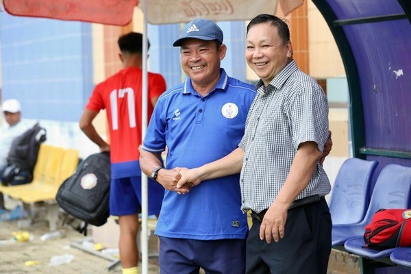 Đại diện BTC chúc mừng HLV Trang Văn Thành sau khi U.21 Đồng Tháp gỡ hòa ở phút 90+5 (Ảnh: Khả Hòa)
