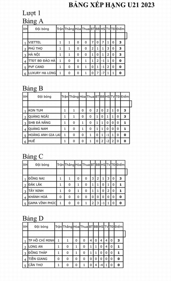 Bảng xếp hạng lượt 1