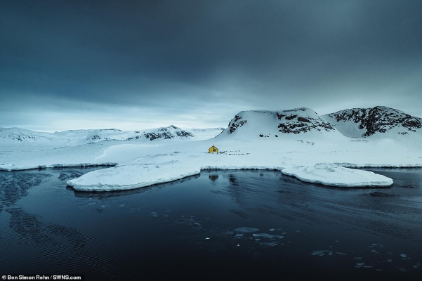 Một tòa nhà duy nhất nằm trên tuyết trong một bức ảnh mà nhiếp ảnh gia người Đức Simon đã chụp được khi bay qua Greenland.