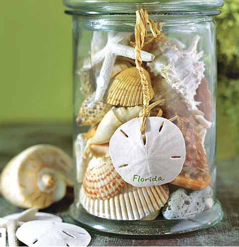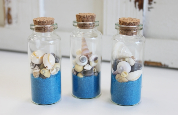 Hoặc những lọ thủy tinh trang trí xinh xắn với vỏ sò, ốc và một ít cát màu…