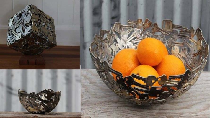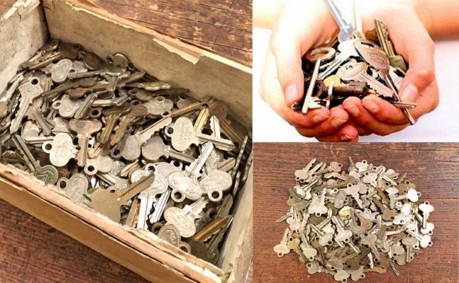 – Những tấm ván/gỗ cũ, giấy báo, bìa carton… hoặc bất cứ thứ gì bạn có thể kết hợp được với chìa khóa cũ. Tùy theo số lượng, kích thước của chìa khóa mà bạn có thể tạo nên những tác phẩm nghệ thuật hay vật gia dụng như hũ đựng đồ, rổ trái cây hay khung trang trí. Thậm chí, bạn có thể làm cả một ma-nơ-canh bằng chìa khóa cũ, không dùng nữa.