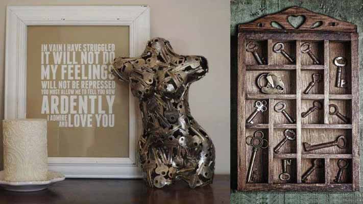 – Đơn giản nhất, bạn có thể sắp xếp ngẫu hứng những chiếc chìa khóa có kiểu dáng cổ trên một miếng gỗ hay bìa carton cũng tạo thành một vật trang trí lạ mắt.