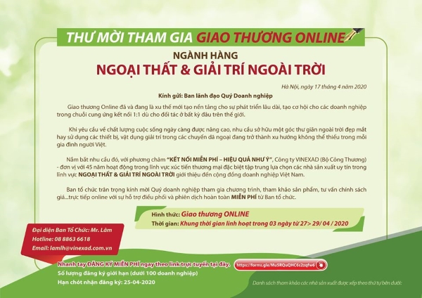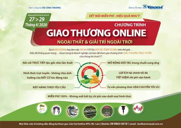 Đặc biệt, dưới sự ủng hộ và chỉ đạo kịp thời từ Bộ Công Thương, toàn bộ hoạt động xúc tiến Kết nối đàm phán trực tuyến trong lĩnh vực Landscape & Garden này được hỗ trợ 100% chi phí tham gia, nhằm giúp các Doanh nghiệp không bị gián đoạn trong chuỗi liên kết cung ứng các ngành hàng.