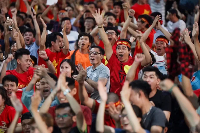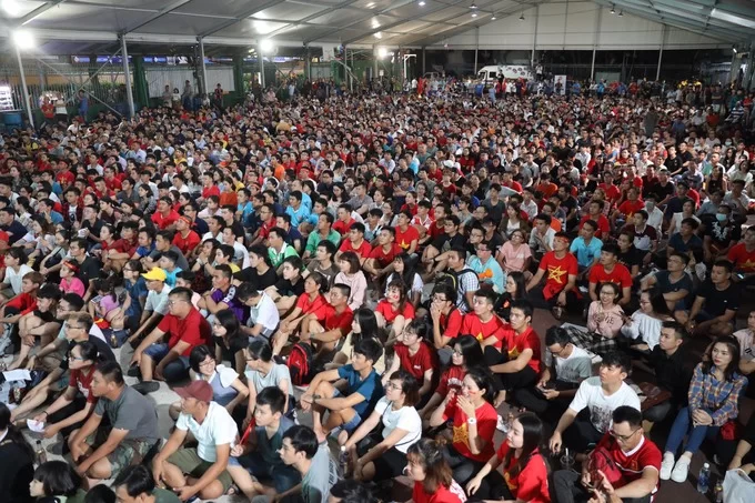 Hơn 1.000 cổ động viên mặc áo cờ đỏ sao vàng, ngồi chăm chú theo dõi trận đấu qua một màn hình led cỡ lớn trong khuôn viên sân vận động.
