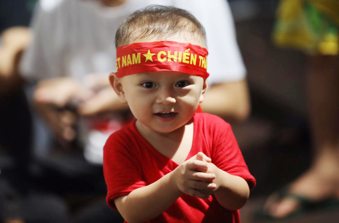 Bé Đăng Khôi vỗ tay ăn mừng cùng hàng nghìn cổ động viên ở sân Hoa Lư.