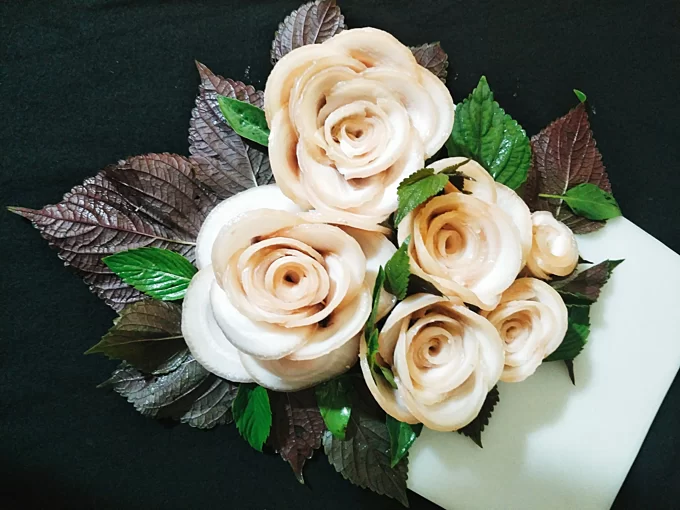 Chị Linh yêu hoa, được học cắt tỉa củ quả từ năm 8 tuổi từ bà và các dì. Những đĩa thức ăn của chị cũng hay được trình bày theo cảm hứng từ hoa cỏ thiên nhiên. Tuy nhiên, đây là lần đầu tiên chị nảy ra ý tưởng và ghép những miếng thịt luộc thành một khóm ‘hoa hồng’.