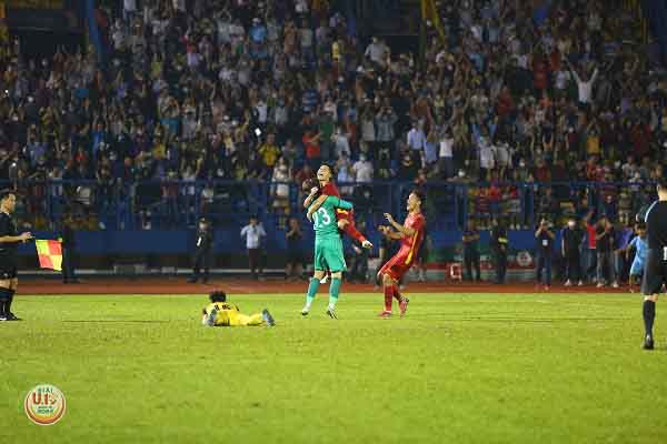 Thủ môn Cao Văn Bình ăn mừng cùng đồng đội sau màn cản phá thành công.