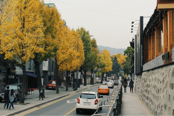 Đường Songcheongdong với những hàng ngân hạnh lá rực vàng trong mùa thu.