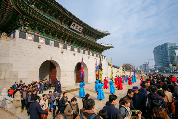 Biểu diễn Lễ đổi gác tại cổng Gwanghawamun, cổng chính của hoàng cung.