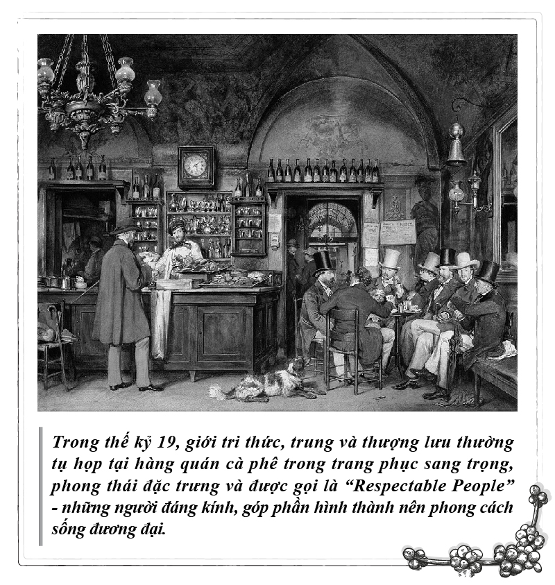 Tại các “salon de café” ở Paris, Vienna, hay London,… giới tri thức, quý tộc thường tụ họp vừa thưởng thức cà phê trong những bộ trang phục sang trọng với áo choàng nhung, nón lông, găng tay da,… Những địa điểm như Café Procope (1686, Paris) trở thành điểm hẹn của những nhà tư tưởng lớn Voltaire và Rousseau; hay Caffè Florian (1720, Venice) là nơi gặp mặt của giới quý tộc và trí thức nổi tiếng như nhà soạn kịch Carlo Goldoni, nhà văn Goethe và Casanova,… Theo đó, “Respectable People”- những người đáng kính, đã trở thành cách gọi chung cho những khách hàng của quán cà phê thời kỳ bấy giờ.