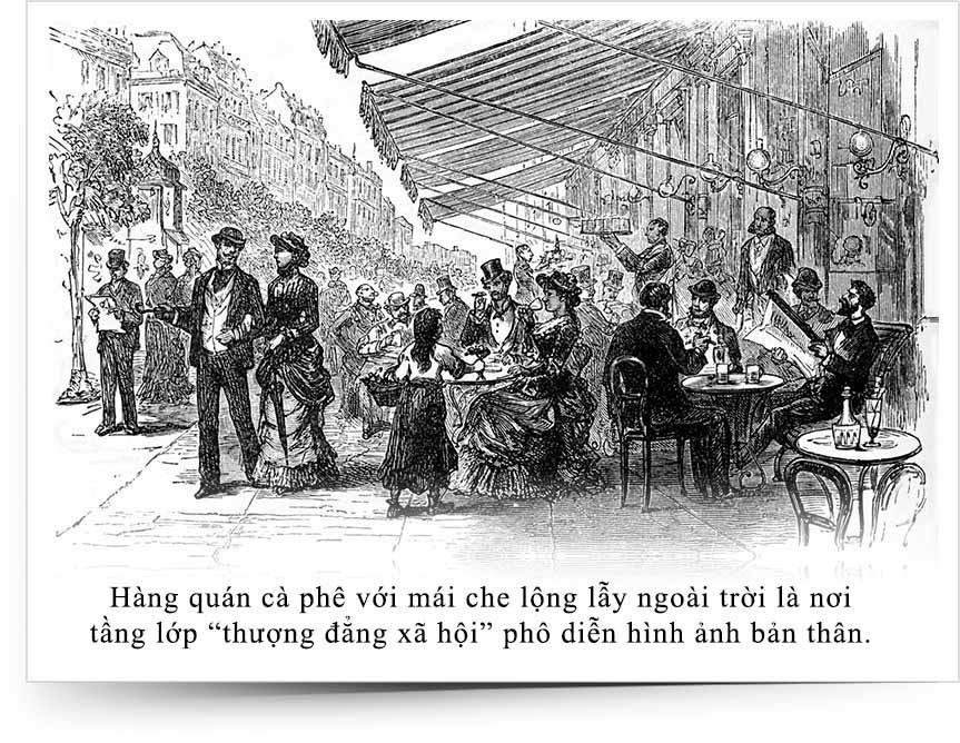 Khởi đầu với khu Carrefour de Buci ở tả ngạn sông Seine và nhất là quần thể thuộc vườn thượng uyển Cung điện Hoàng gia (Les Jardins Du Palais Royal) là nơi chốn của những hàng quán cà phê “ngoại hạng”, nội thất hoành tráng được gọi là Mirrored Luxury Coffee (gương treo bốn mặt) để khách hàng “tự chiêm ngưỡng và phô diễn hình ảnh bản thân”! Đây cũng là thời kỳ vàng son của những hàng quán cà phê mái che lộng lẫy ngoài trời (Coffee Pavilion, Coffee Tent).