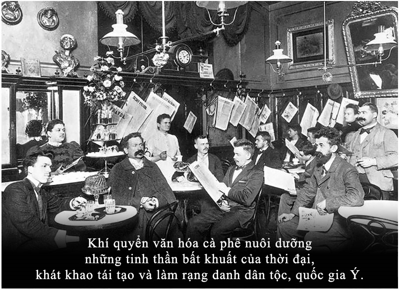 Khí quyển văn hóa cà phê ấy đã nuôi dưỡng và truyền bá rộng rãi những tư tưởng cấp tiến của Ý, từ văn hóa nghệ thuật đến kinh tế và tổ chức xã hội… Có thể kể đến như trường phái Lãng mạn (Romanticismo), phong trào Macchiaioli tái tạo nghệ thuật Ý, trào lưu nghệ thuật Futurist (Chủ nghĩa vị lai), phong trào nghệ thuật Transavanguardia… đều khởi xuất và lan tỏa từ hàng quán cà phê.
