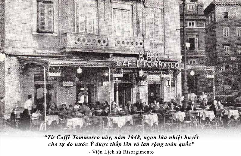 Caffè Florian (Venice), Caffè Pedrocchi (Padua), Caffè delle Giubbe Rosse (Florence), Caffè Fiorio (Torino), Antico Caffè Greco (Rome), Caffè Tasso (Bergamo), Caffè Tommaseo (Trieste), Caffè dell’Ussero (Pisa), Caffè dei Cacciatori (Bologna)… đi vào lịch sử Ý như nơi tổ chức các cuộc thảo luận chiến lược cho phong trào Risorgimento, nơi Hội Thanh niên Italia, sinh viên đại học, công nhân và các chí sĩ yêu nước tập hợp thành đội quân tình nguyện “I Mille – Một nghìn”. Đây cũng chính là hạt nhân quân đội đầu tiên đóng vai trò then chốt trong phong trào giải phóng, thống nhất Ý.
