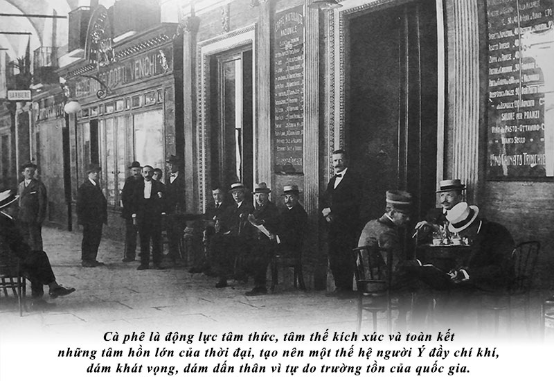 Trong suốt diễn trình từ khởi phát khát vọng “Ý trở thành một và không thể chia cắt”, minh định bản sắc, giáo dục tinh thần quốc dân đến khi hợp nhất nước Ý, cà phê đã luôn giữ vai trò không thể thiếu. Có thể nói, cà phê là động lực tâm thức, tâm thế kích xúc và toàn kết những tâm hồn lớn của thời đại, tạo nên một thế hệ người Ý đầy chí khí để vượt qua khác biệt giữa các lãnh địa đang chia năm xẻ bảy, làm nên sức mạnh thần kỳ tái lập một nước Ý toàn vẹn về lãnh thổ, một dân tộc Ý có đặc trưng văn hóa khác biệt, rạng danh.