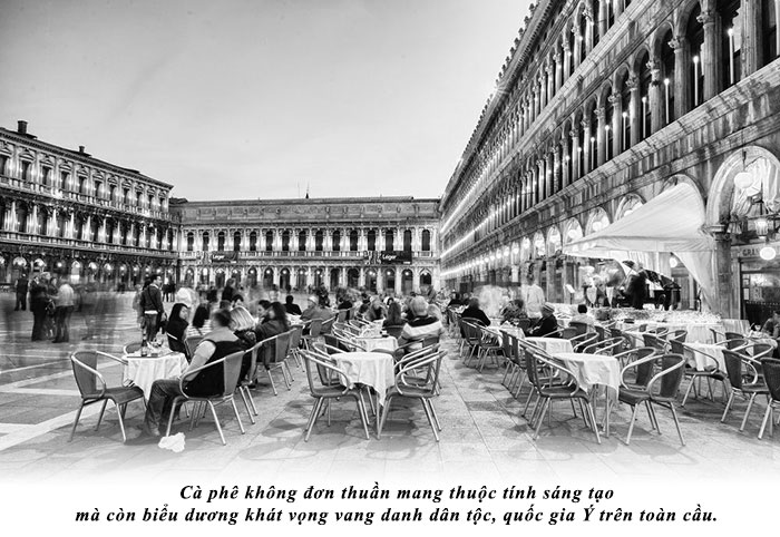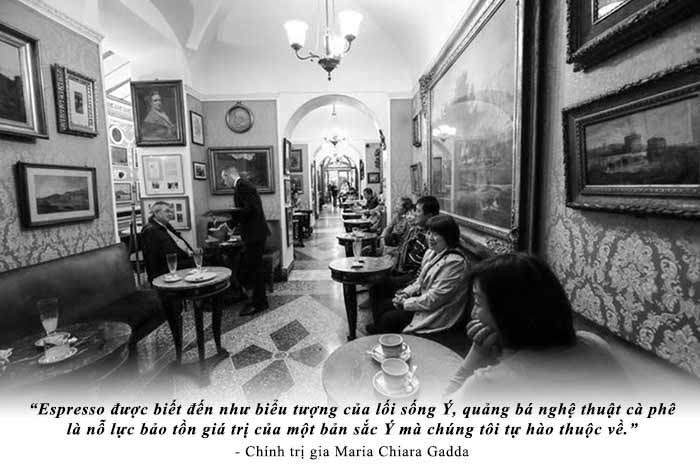 Thưởng lãm cà phê liên quan mật thiết đến lịch sử văn hóa. Và thực tế cũng đã chứng thực, trong suốt tiến trình khải ngộ bản sắc Ý, phẩm cách Ý, cà phê đã luôn là chất xúc tác tâm thức, tâm thế để người Ý ghi dấu chí khí và vinh thăng văn hóa dân tộc. Ở chiều kích này, cà phê phong cách Ý cũng mang trong nó nội hàm “hồn nước” bàng bạc trong khát vọng định danh bản sắc khác biệt của người Ý.