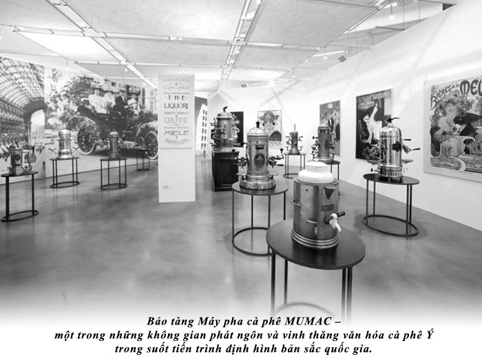 Bên cạnh đó, Ý xây dựng những bảo tàng cà phê chuyên biệt như Bảo tàng Máy pha cà phê MUMAC, Bảo tàng Cà phê Lavazza, Bảo tàng Cà phê Dersut, Bảo tàng Cà phê Bontadi, Bảo tàng Cà phê Omkafe… trưng bày hiện vật, tài liệu quan trọng trong lịch sử cà phê, bao gồm nghệ thuật tạo tác, trình bày và triết lý sống định hình trong nghi thức thưởng lãm cà phê. Những thành phố vang danh văn hóa cà phê như Rome, Milan, Torino, Venice… được chọn là thành phố sáng tạo. Trong đó, những hàng quán cà phê lịch sử: Antico Caffè Greco, Caffè Tommaseo, Caffè Mulassano… được vinh danh là di tích quốc gia nằm trong tour du lịch khám phá tầm ảnh hưởng của cà phê suốt tiến trình hình thành xã hội Ý hiện đại.