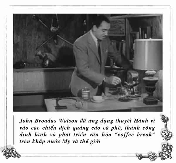 Với việc áp dụng các kỹ thuật của thuyết hành vi, đặc biệt là công thức ba tác nhân kích thích: nỗi sợ hãi, giận dữ và tình yêu để thúc đẩy hành vi tiêu dùng, Watson đã khởi xướng nhiều chiến dịch quảng cáo thành công. Đặc biệt, trong các chiến dịch quảng cáo cho cà phê vào năm 1921 và những năm 1952, trên cơ sở sử dụng các kỹ thuật điều hòa cổ điển kết hợp ý tưởng về giờ nghỉ giải lao uống cà phê, Watson đã cho ra đời thuật ngữ “coffee-break” và định hình nó như một nét văn hóa, lối sống của người Mỹ lúc bấy giờ. Qua các chiến dịch quảng cáo do John Board Watson thực hiện, “coffee-break” nhanh chóng được phổ biến, trở thành một vấn đề mang tính quốc gia và là một trong những nền tảng quan trọng trong đời sống của người lao động Mỹ thế kỷ 20.