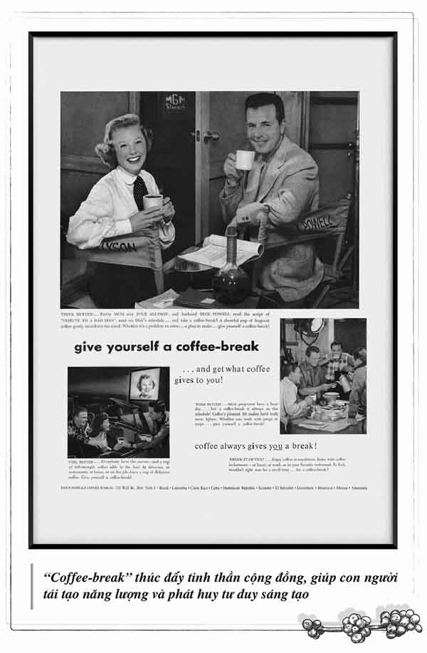 Cùng thông điệp “Give yourself a coffee-break… and get what coffee gives to you”, những giá trị của cà phê đem lại cho người thưởng thức như “Work better” – Làm việc tốt hơn, “Feel Better” – Cảm giác hạnh phúc hơn, “Think Better” – Suy nghĩ tốt hơn, được khẳng định mạnh mẽ qua những mẫu quảng cáo. Với các câu chuyện cụ thể cùng hình ảnh của những con người hạnh phúc, thuộc mọi lĩnh vực từ công nhân, ngư dân, nhân viên văn phòng, kỹ sư, chuyên gia, nghệ sỹ… cùng ngồi xung quanh cốc cà phê để nghỉ ngơi, nạp năng lượng, tìm lại sự tỉnh táo, tập trung làm việc; hay trò chuyện, chia sẻ; tìm kiếm những ý tưởng… tại nơi làm việc, văn phòng, trong bếp ăn, nhà hàng… vào bất kỳ thời điểm nào trong ngày, đã khơi gợi, thúc đẩy cộng đồng thực hiện “coffee-break” . Ngay sau chiến dịch này, cùng việc thúc đẩy lượng tiêu thụ cà phê tại Mỹ, “coffee-break” được đưa vào từ vựng quốc tế, và đến năm 1957 đã trở thành điểm thương lượng về chính sách phúc lợi cho công nhân, người lao động trong ngành công nghiệp Mỹ.