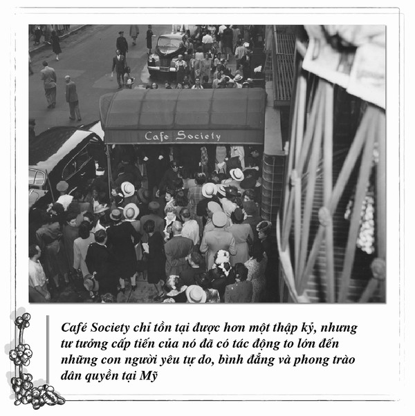 Trong đó, Café Society, được thành lập năm 1938, là một địa điểm nổi bật của Greenwich, nơi hòa nhập chủng tộc đầu tiên ở New York. Khác với các không gian khác chỉ dành cho người da đen hoặc da trắng, Café Society đã đối xử bình đẳng với tất cả khách hàng, mở cửa chào đón tất cả thành viên thuộc mọi chủng tộc. Đây là điều chưa từng có trước đây. Năm 1940, Café Society mở chi nhánh thứ hai và nhận được nhiều sự ủng hộ tích cực, thu hút các nhà văn, trí thức, các chính trị gia bao gồm Ralph Bunche, Richard Wright, E. Franklin Frazier, Eleanor Roosevelt… Chính trong môi trường cởi mở, hòa nhập này đã giúp giới trí thức, những con người yêu hòa bình, hình thành nhiều ý tưởng và kế hoạch hành động vì một thế giới tốt đẹp và bình đẳng hơn.