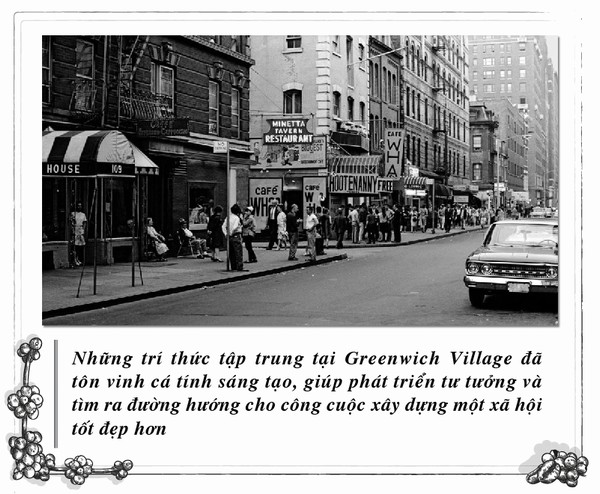 Trong bối cảnh đó, Greenwich Village, một khu phố phía tây New York, nổi tiếng là đô thị phóng khoáng với cộng đồng cư dân tiến bộ và những câu lạc bộ, nhà hát, hàng quán cà phê, đã trở thành nơi trú ẩn của những người có tư tưởng và thái độ cấp tiến, sáng tạo, như: William Faulkner, Eugene O’Neill Robert, Mark Twain, Maxwell Bodenheim, Bob Dylan, Billie Holiday… Greenwich cũng là nơi khai sinh của các phong trào, ý tưởng mới trên nhiều phương diện như nghệ thuật, văn hóa, chính trị… Có thể nói Greenwich đóng vai trò quan trọng trong việc tạo dựng nền văn hóa Mỹ đa dạng, đặc sắc ở thế kỷ 20 và tái định hình tư tưởng thời đại về các vấn đề xã hội như phân biệt chủng tộc, quyền phụ nữ, giới tính…