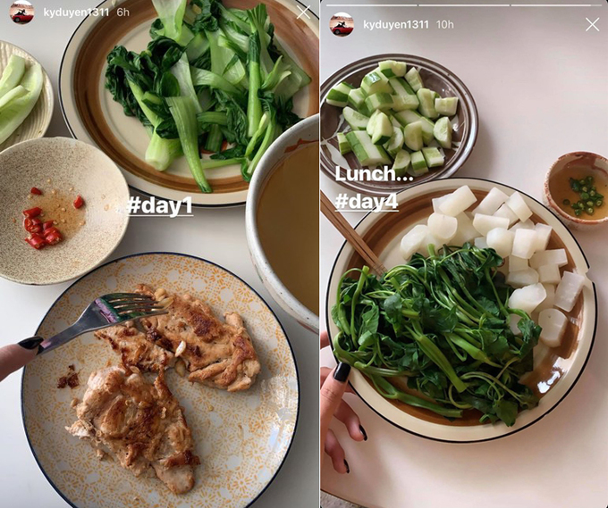 Cô nàng thú nhận đang phải ‘bóp mồm, bóp miệng’, ngày ăn hai bữa toàn rau xanh như trong hình để “bù lại những ngày ăn uống thỏa thích trước khi đi ghi hình Cuộc đua kỳ thú 2019”.