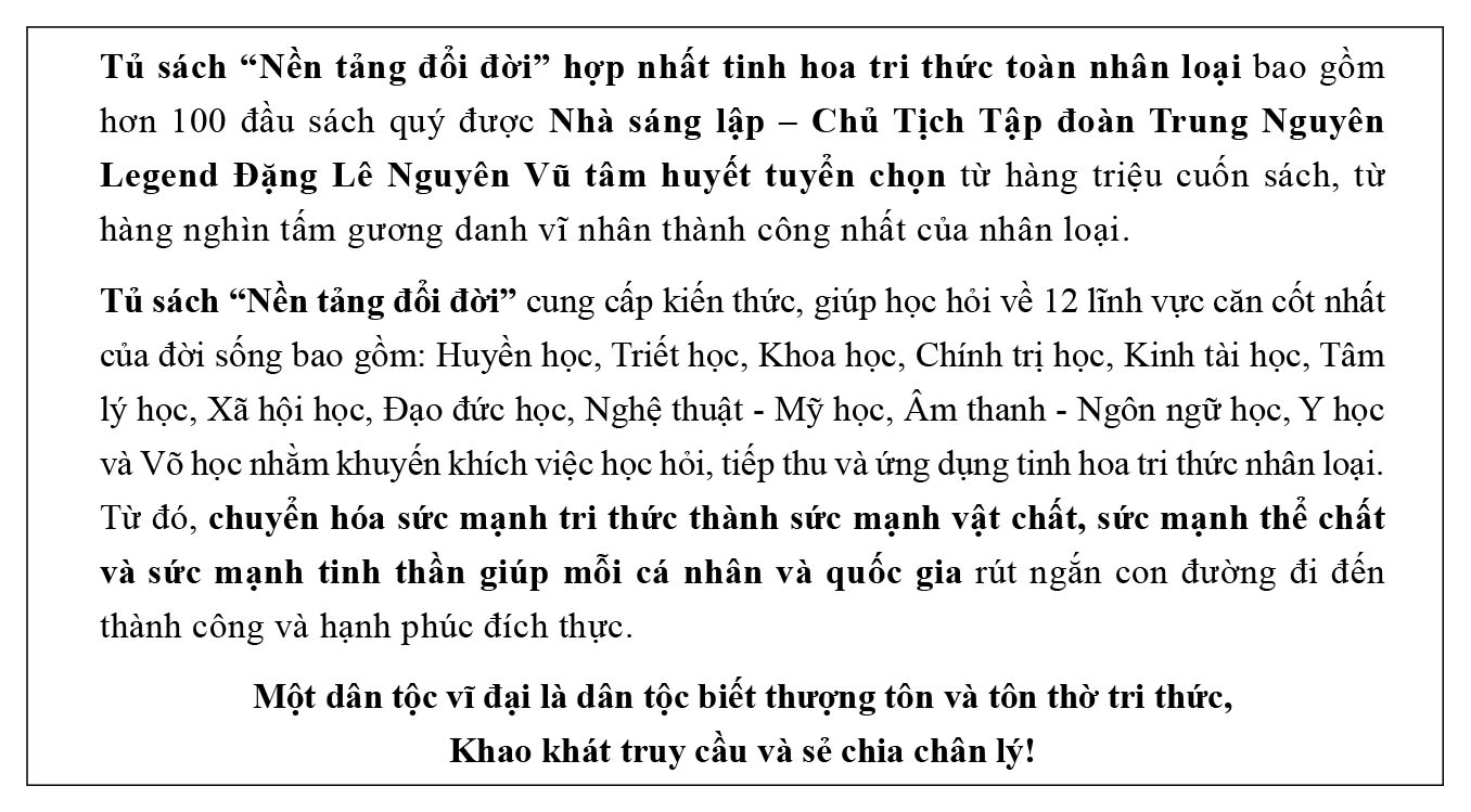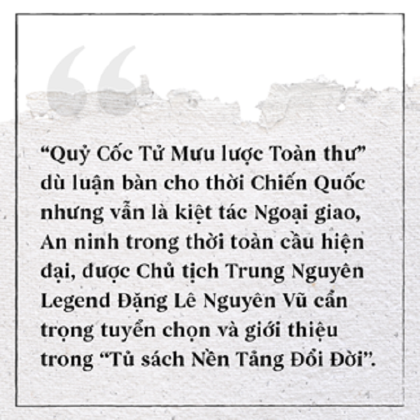 “Quỷ Cốc Tử mưu lược toàn thư” là một trong những đầu sách quý thuộc Tủ sách Nền Tảng Đổi Đời được Nhà sáng lập – Chủ Tịch Tập đoàn Trung Nguyên Legend Đặng Lê Nguyên Vũ cẩn trọng, tuyển chọn thuộc lĩnh vực Chính trị – Ngoại giao – Quân sự trong “Tủ sách Nền Tảng Đổi Đời”.
