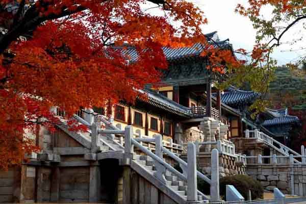 Nằm trên sườn núi Toham, chùa Bulguksa được xem biểu tượng văn hóa Phật giáo của Hàn Quốc. Đây là ngôi chùa cổ nhất Hàn Quốc, được xây dựng dưới vương triều Silla (57 TCN tới năm 935), đã được UNESCO công nhận là Di sản thế giới. Bulguksa nổi tiếng với rất nhiều di tích đá cổ được coi là “quốc bảo” của nước Hàn, hàng nghìn bậc đá và 3 nhịp cầu tên Cheongungyo, Baegungyo, Chibogyo tượng trưng cho những chiếc cầu dẫn đến thiên giới. Chùa còn có hai tòa tháp Seokgatap và Dabotap là 2 trong những tòa tháp chùa đẹp nhất Hàn Quốc. Vào mùa thu, cả ngôi chùa được bao bọc trong những tầng lá đủ màu sắc, chủ yếu là lá phong đỏ, vàng… tạo nên một không gian thu rộng bao la, lãng mạn và cực kỳ yên bình. Bạn nên đăng ký ở lại chùa, tham dự một buổi trà đạo truyền thống và thức dậy sớm, ngắm lá thu trong không gian cổ kính tràn nắng ban mai.