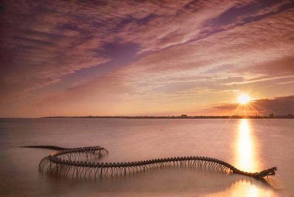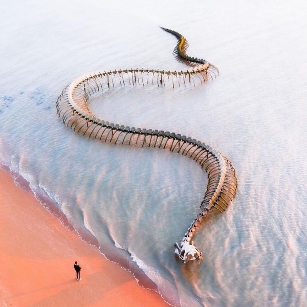 Nước Pháp được biết đến với cảnh vật nên thơ và lãng mạn. Không những thế, nước Pháp còn nổi tiếng với nhiều công trình điêu khắc vô cùng nổi tiếng. Và chắc hẳn bạn chẳng thể nào không thốt lên lời trầm trồ, ngạc nhiên xen lẫn rùng mình khi tận mắt chiêm ngưỡng tác phẩm điêu khắc kì dị có hình bộ xương rắn bò trườn trên mặt nước. Tác phẩm có vẻ giống y như thật khi nhìn từ trên cao tại một bãi biển hoang sơ ngoại ô nước Pháp.