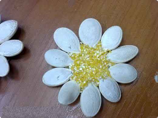 Chuẩn bị: Hạt bí, giấy bìa, keo sữa, keo nến, hạt ngũ cốc.