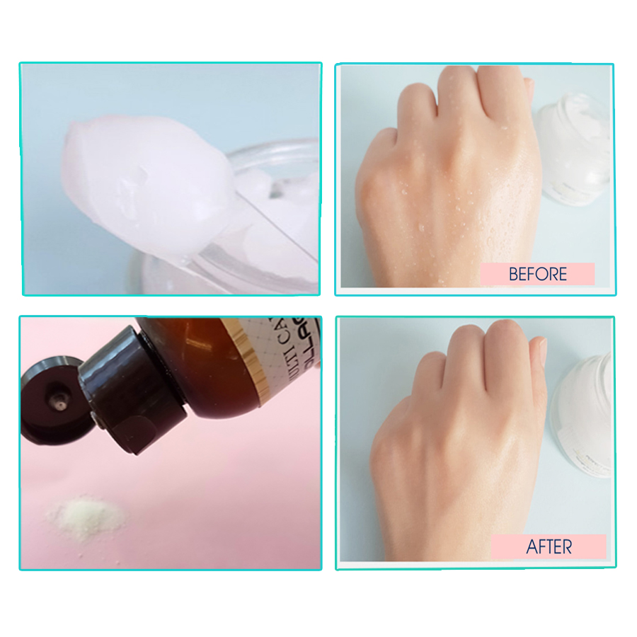 Dùng thìa lấy 1 lượng kem tế bào gốc vừa đủ (10), trộn đều bột collagen (1) tương đương tỷ lệ (10:1) bôi đều khắp mặt, nhẹ nhàng matxa cho kem thấm đều.