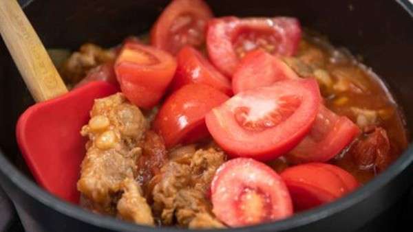 Mở nắp nồi, thêm 2 quả cà chua thái múi cau còn lại vào đảo đều. Đun thêm khoảng 10 phút rồi tắt bếp.