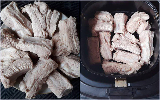 Sườn sơ chế sạch với nước muối loãng và giấm, sau đó trụng qua nồi nước đang sôi để loại bỏ bọt bẩn, rồi rửa lại với nước. Để ráo. Cho sườn vào chảo có dầu ăn chiên cho vàng (nhà mình chiên với nồi chiên không dầu).