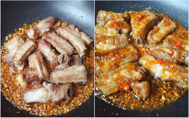 Sau đó cho sườn non vào chảo nước xốt đảo đều cho sườn thật thấm đẫm đều nước xốt, cuối cùng thêm ớt cắt nhỏ vào, tắt bếp, rắc tiêu là hoàn thành.