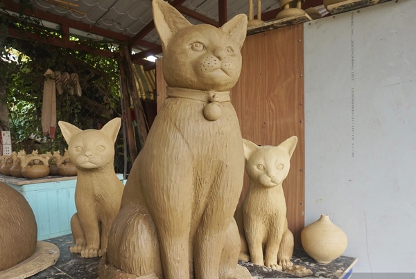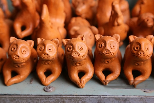 Linh vật mèo được nặn tỉ mỉ, mọi công đoạn đều được thực hiện thủ công. Tùy vào kích thước và đường nét hoa văn trang trí mà các nghệ nhân có thể mất từ vài giờ đến nhiều ngày để tạo ra sản phẩm.
