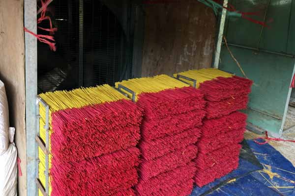 Riêng công đoạn phơi nhang trên các vỉ tre, tưởng dễ dàng nhưng cũng “nhiêu khê” không kém vì phải trông vào thời tiết. Nếu trời mưa mà không thu vào kịp, bột nhang sẽ bị rã, hư cả mẻ nhang, còn nếu nắng không to, nhang dễ bị xuống màu, nhợt nhạt, không bắt mắt. Sau khi giao cho các đại lý, nhang mới được tẩm hương và gắn nhãn hiệu theo yêu cầu của khách hàng.