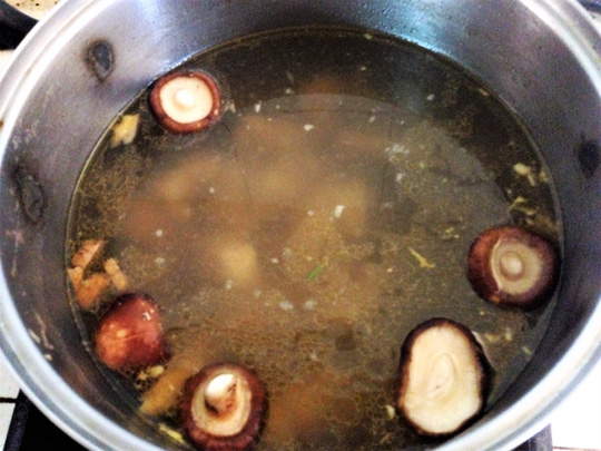 – Bắc chảo lên bếp, phi thơm tỏi cho thịt gà vào xào đến khi thịt săn lại, nêm nếm gia vị cho vừa ăn. Trút gà vào nồi, cho thêm 2 lít nước, vài lát gừng và nấm đông cô vào cùng để nước dùng thêm thơm ngon. Nấu gà với lửa nhỏ khoảng 40 phút, chịu khó vớt bọt cho nước dùng được trong.