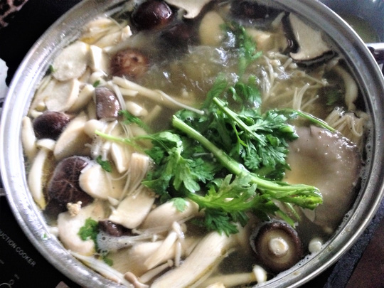 – Trút gà hầm vào nồi lẩu, đặt lên bếp. Khi nước lẩu sôi, cho thêm các loại nấm vào, chờ đến khi nấm chín cho thêm rau.