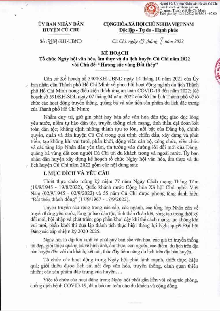 Ngày 12 tháng 8 năm 2022 Ủy ban nhân dân huyện Củ Chi đã ban hành kế hoạch số 7204/KH-UBND về việc tổ chức Ngày hội văn hóa, ẩm thực và du lịch huyện Củ Chi năm 2022 với chủ đề “Hương sắc vùng Đất thép”.