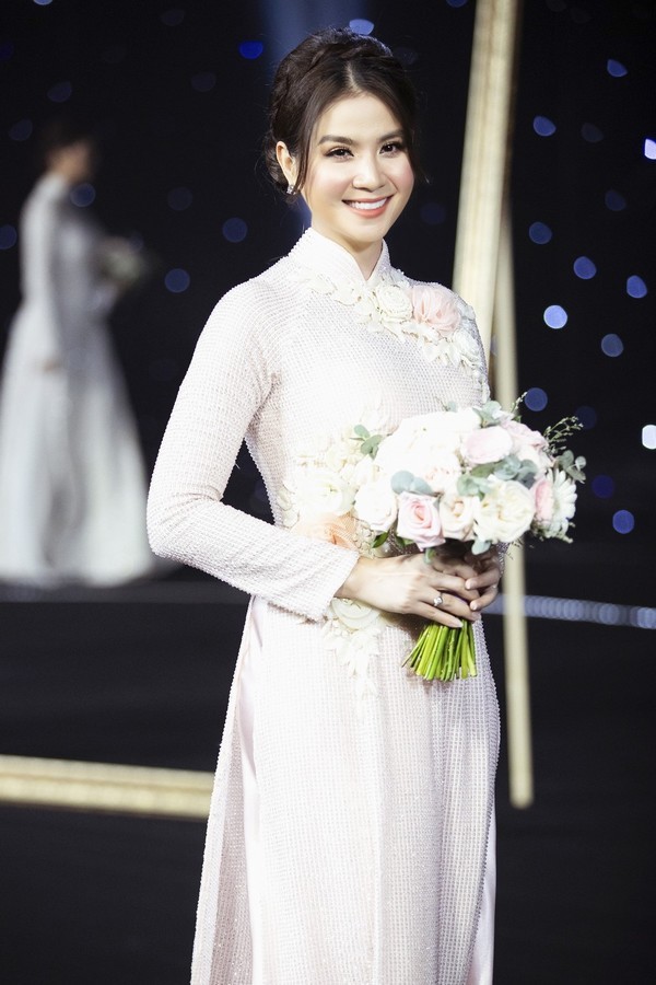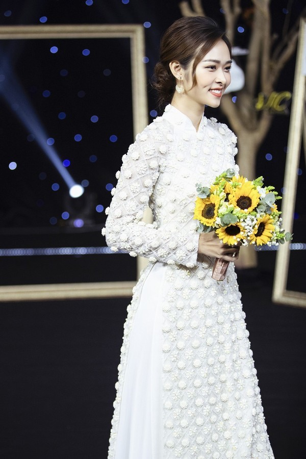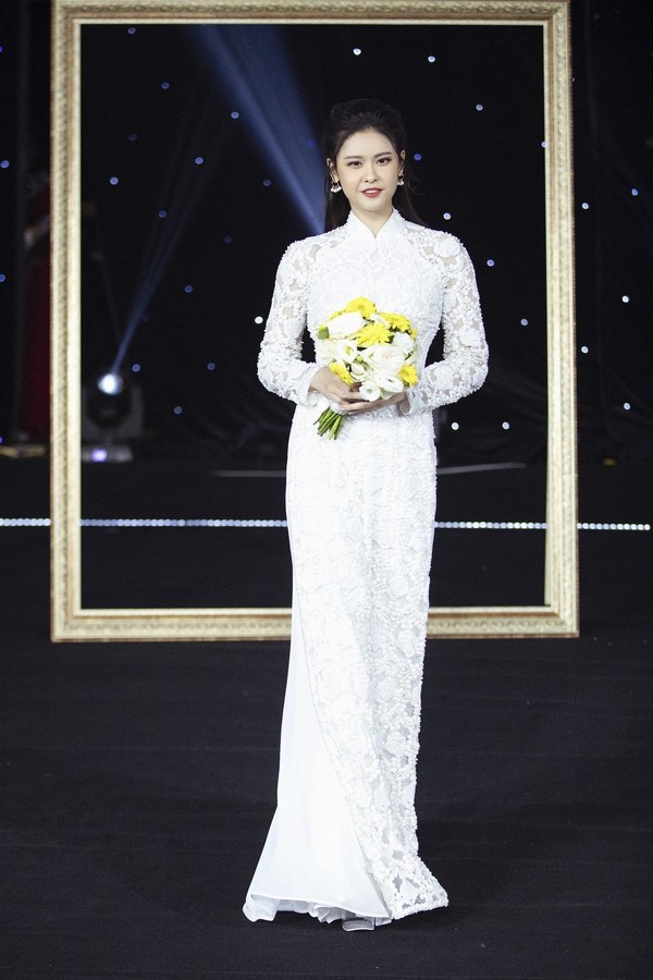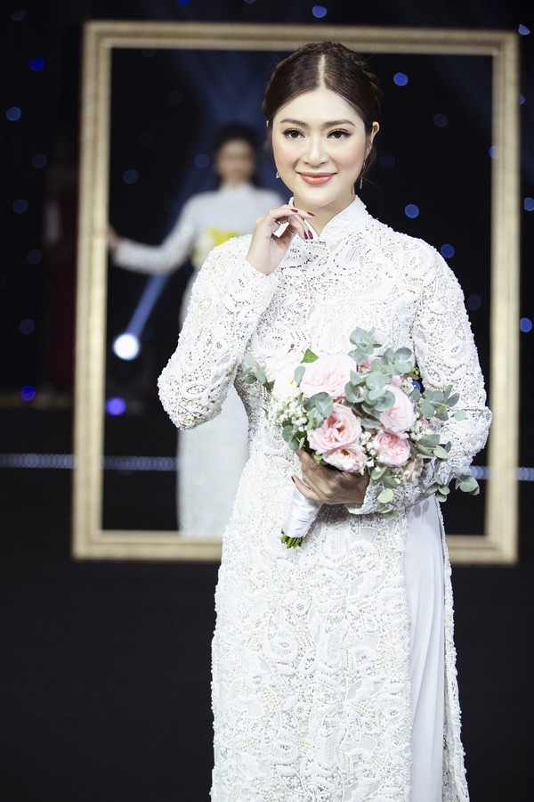 Kha Ly tái hiện lại khoảnh khắc kết hôn trên sân khấu khi diện mẫu áo dài trắng có điểm nhấn là bông hoa được thêu tay đầy độc đáo phía bên ngực phải.