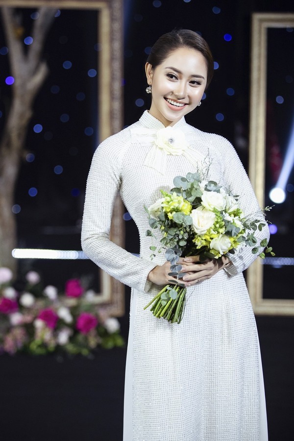 Diệp Bảo Ngọc lựa chọn thiết kế áo dài trắng tôn dáng với hoạ tiết hoa đính nổi, xếp lớp độc đáo giúp người đẹp nổi bật hơn.