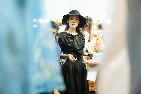 Kinh nghiệm có được từ những lần trình diễn trước đây giúp Nhã Băng không khó để hoàn thành tốt vai trò lần này. Diện một chiếc đầm đen huyền bí với điểm nhấn trước ngực, Lê Nhã Băng toát lên thần thái sắc lạnh và chuyên nghiệp khi sải những bước catwalk trong buổi tập.
