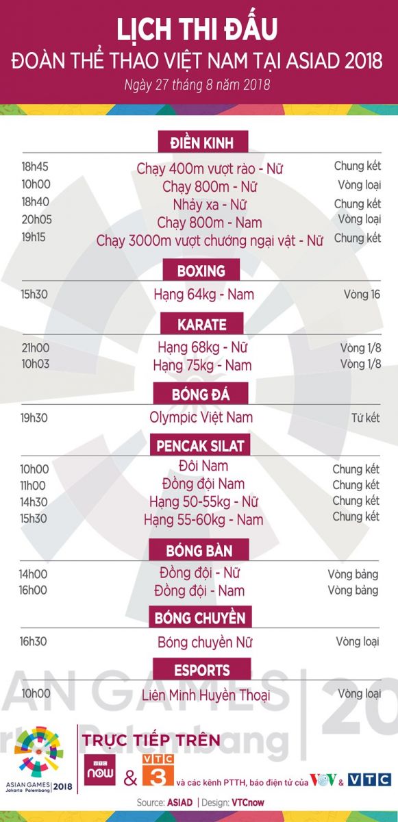 Tính đến 17h00 ngày 26/8/2018, Đoàn Thể thao Việt Nam giành được 01 huy chương vàng, 07 huy chương bạc, 11 huy chương đồng. Trong ngày ngày 27/8/2018, Đoàn Thể thao Việt Nam sẽ thi đấu các môn tại Jakarta: Điền kinh, Boxing, Karate, Pencak Silat, Bóng đá nam, Bóng chuyền, Bóng bàn.