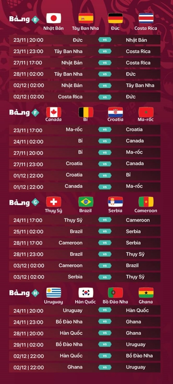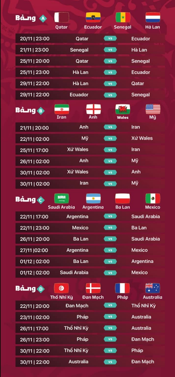 Lịch thi đấu vòng bảng World Cup 2022