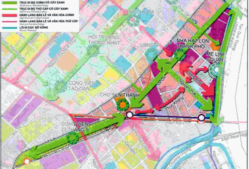 Ý tưởng quy hoạch các tuyến phố đi bộ liên hoàn (màu xanh lá) ở trung tâm TP HCM